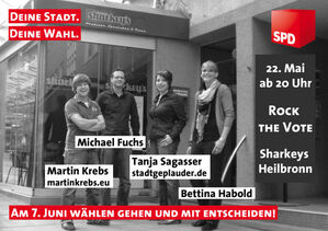 Tanja Sagasser, Martin Krebs, Bettina Habold und Michel Fuchs, die vier Juso-Gemeinderatskandidaten in Heilbronner veranstalten zusammen mit den Kandidatinnen und Kandidaten der Jusos aus dem Landkreis am Freitag, dem 20. Mai 2009 eine Jungwählerparty im Sharkey’s Heilbronn (Gustav-Binderstr., direkt hinter dem Hafenmarktturm).
